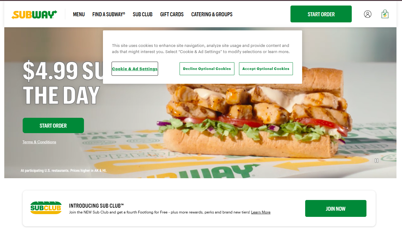 Subway uses a simple, centered banner near the top of the page that blends into the layout while still standing out enough to prompt action.