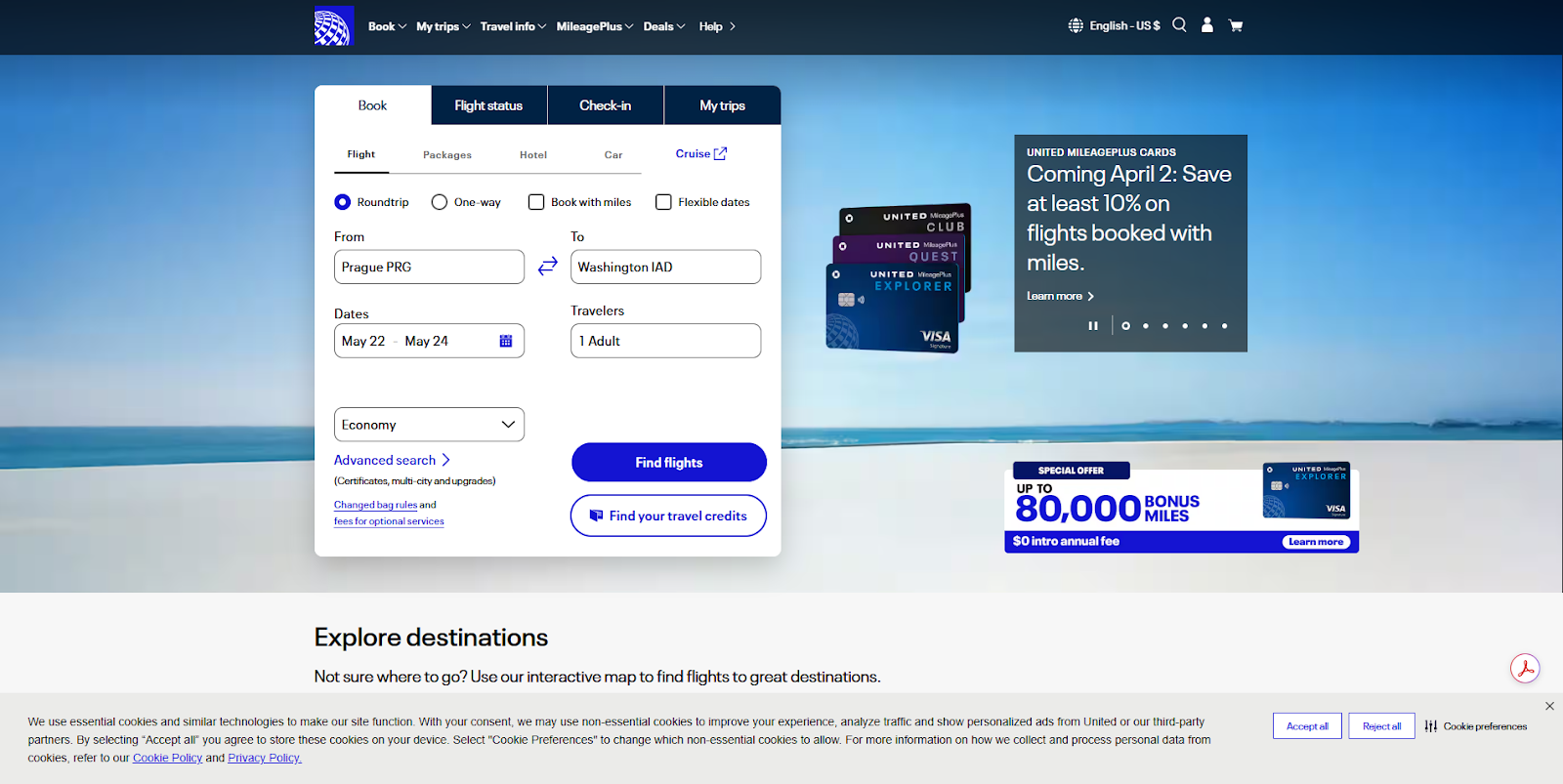 United takes a straightforward approach with a full-width banner at the bottom of the screen. Itâs easy to notice, but doesnât interrupt the booking flow or compete with the main content.
