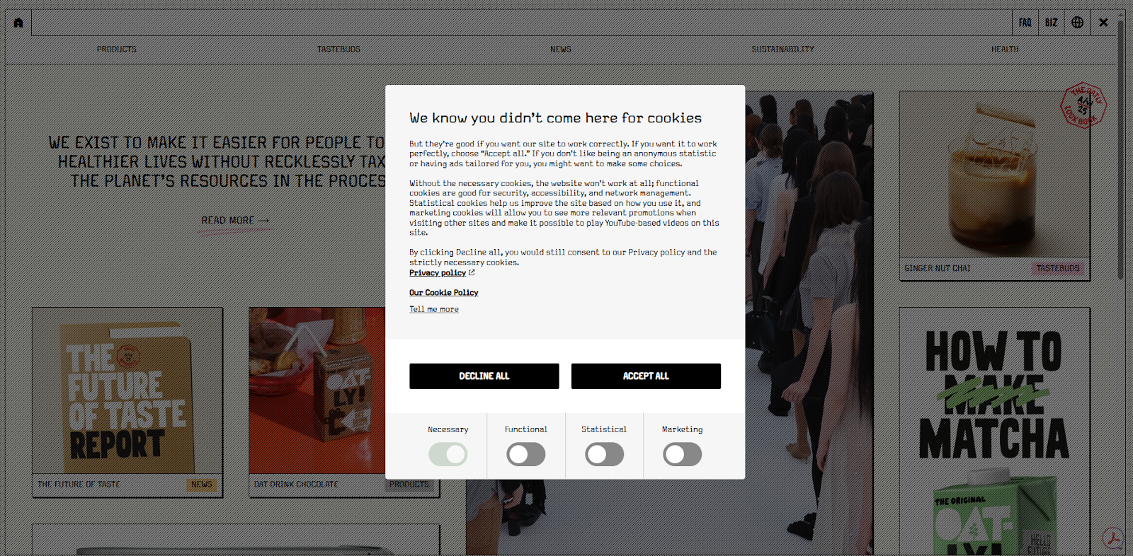 Oatly leans fully into its brand voice here. The banner reads more like part of the website than a compliance requirement, with conversational copy and a tone that feels intentionally informal.