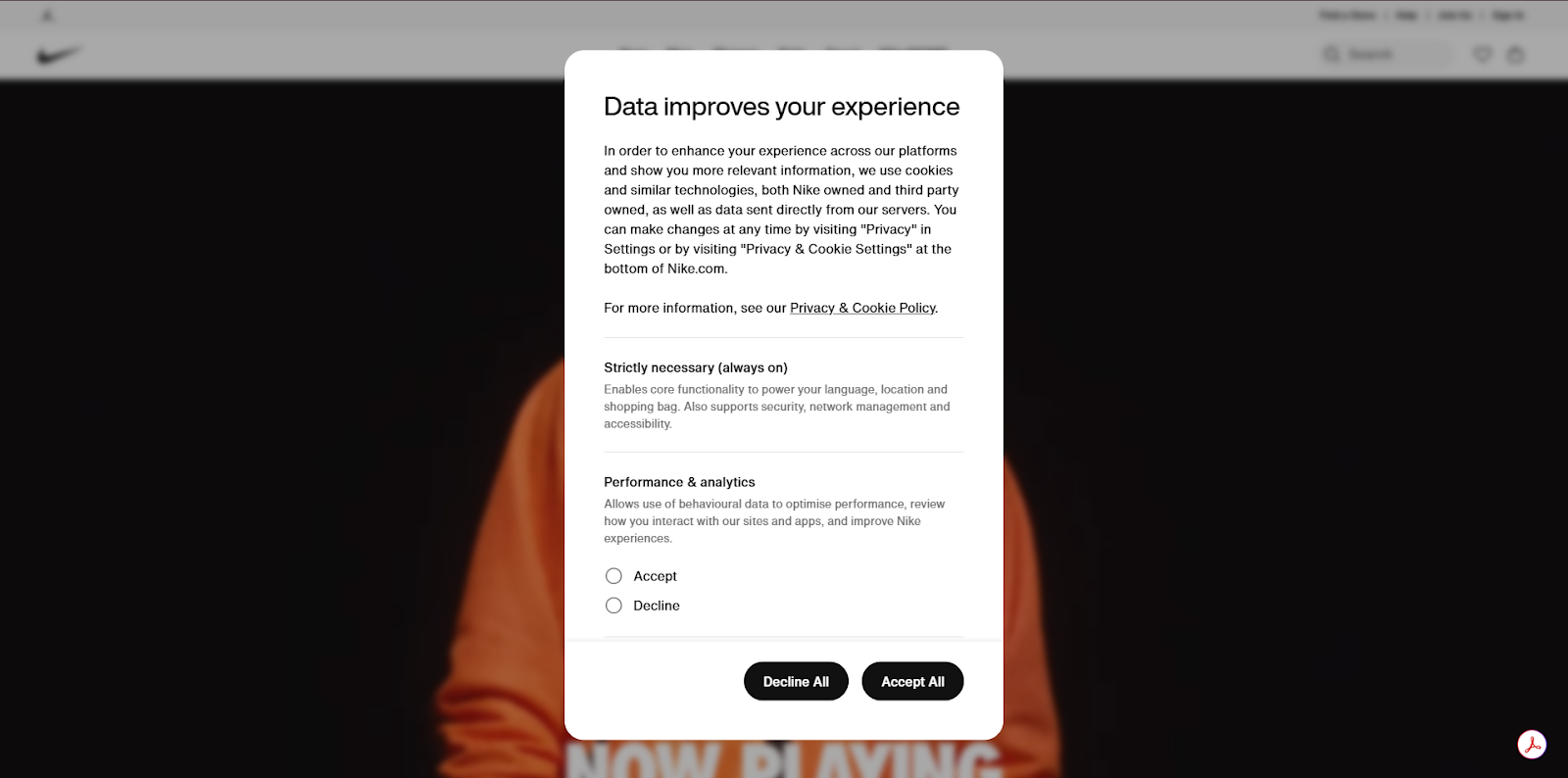 Nike uses a centered modal that takes over the screen and walks users through cookie categories in a structured way. It feels more like a settings panel than a quick notice.