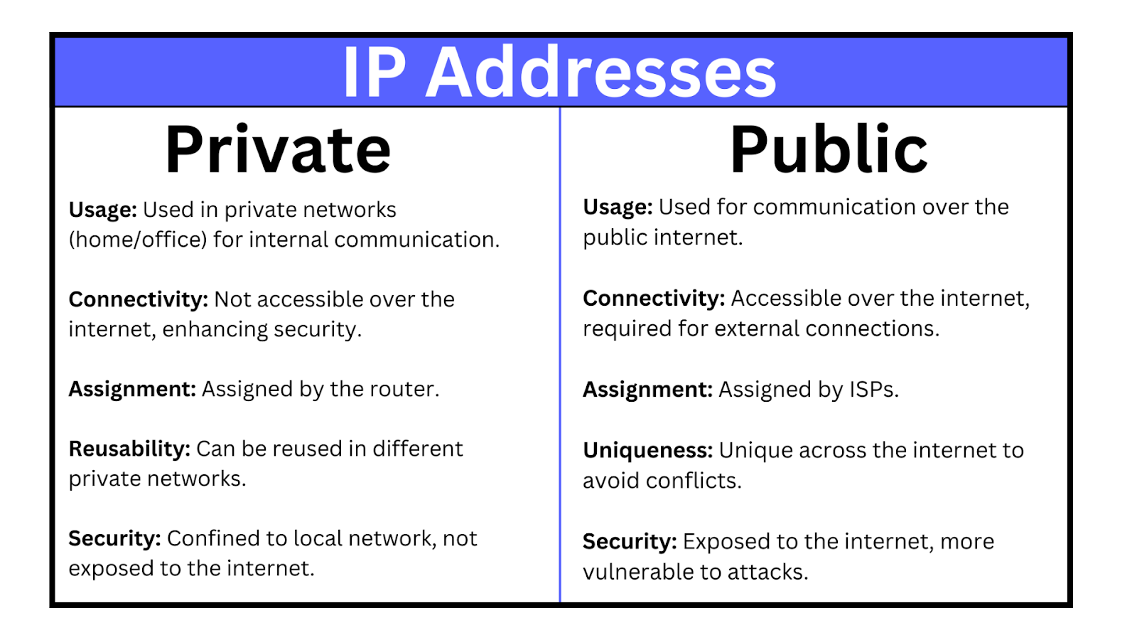 - Uniqueness: Each public IP address is unique across the entire internet to avoid conflicts.