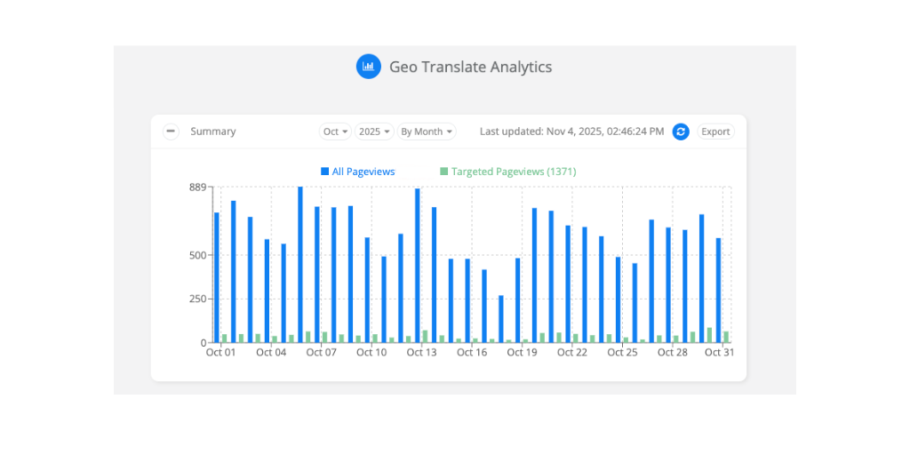 During October 2025, TouchStay recorded 1,371 targeted pageviews that were directly attributed to GeoTargetly’s translation and localization rules. This indicated strong uptake among visitors from Spanish, French, German, and Italian speaking countries. TouchStay saw higher engagement and increased sign-ups in these regions, and users spent more time on the website than before. International visitors also commented on the ease of access and increased trust, especially those who later received live demos in their own language.