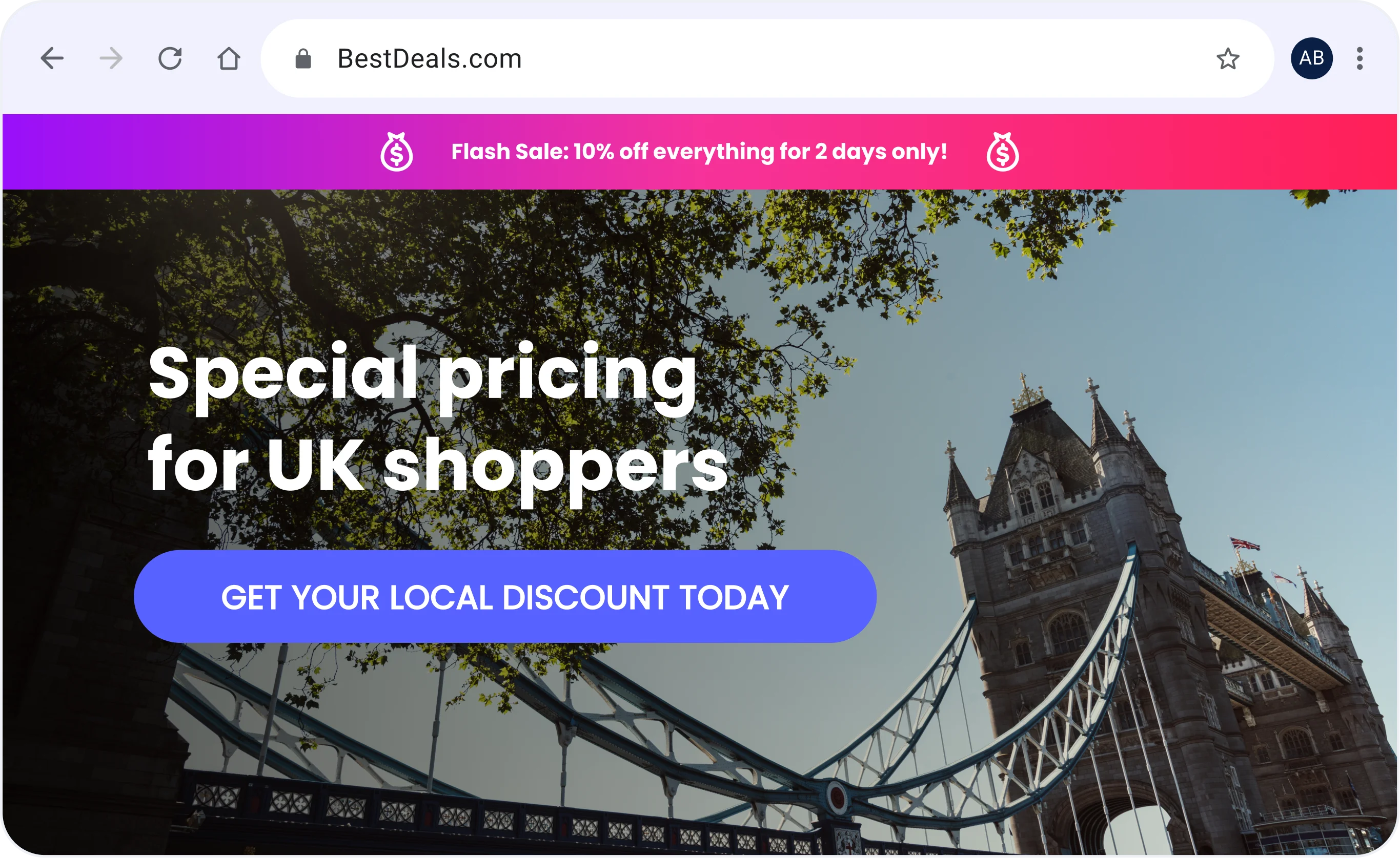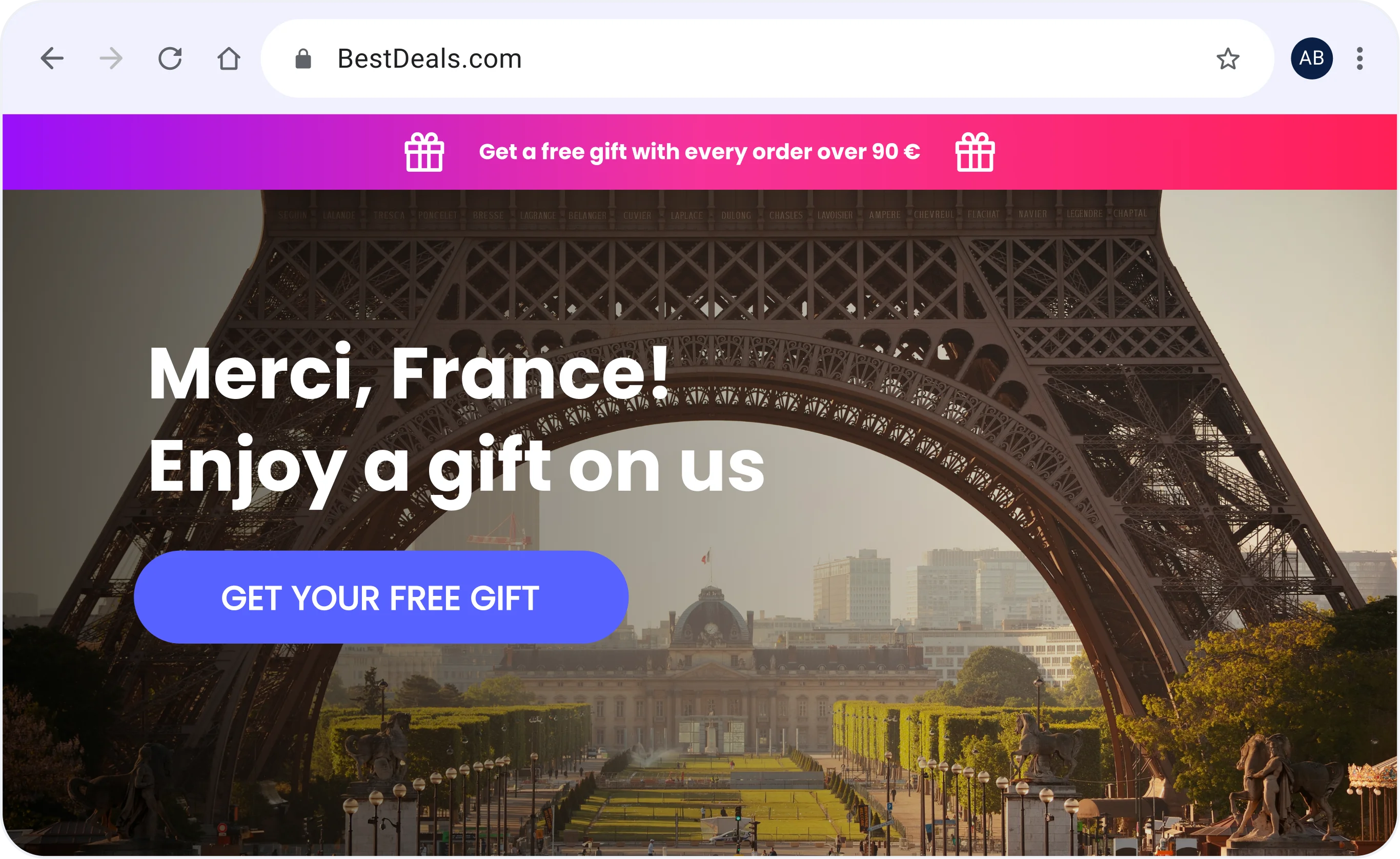 Swap banners, hero graphics, screenshots, and other visuals through automatic image swaps that change based on each visitor’s region or market. This helps you display the most relevant creative to every audience without editing your page manually.